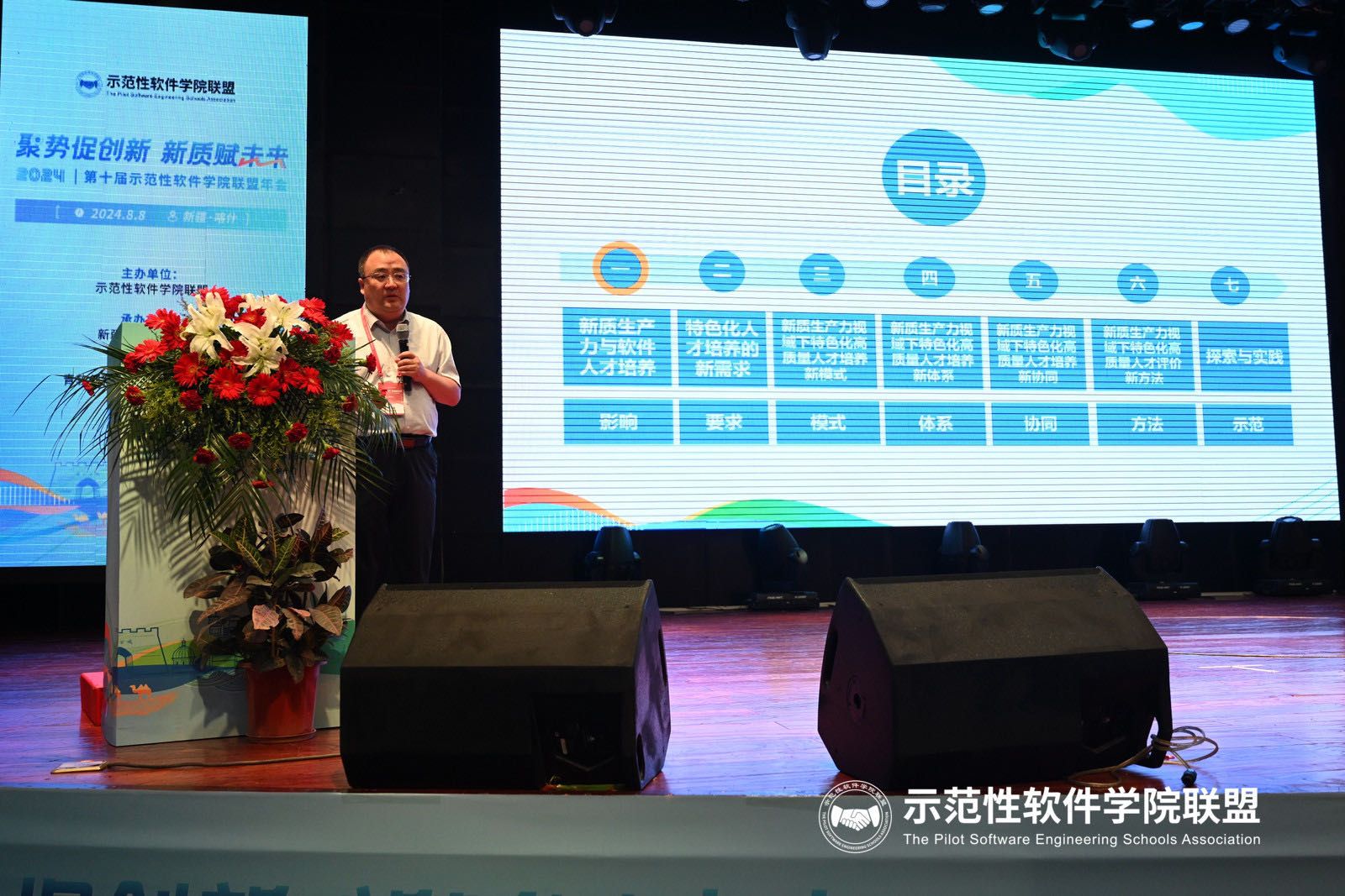 郑江滨受邀在大会发表主题演讲,围绕新质生产力视域下的软件人才培养的新模式、新体系、新协同及人才培养新方法等多个维度,分享了学院近年来推动软件教育持续优化与提升的经验与前瞻思考。他指出新质生产力的形成是由技术革命性突破、生产要素创新性配置以及产业深度转型升催生的结果,具有高科技、高效能、高质量的特征,软件人才培养与新质生产力是相互适应、促进与共同进化的,在新质生产力的驱动下,软件人才培养逐渐向新工科、大交叉、复合型、高质量的需求转变。学院通过系统规划学业、校企联合培养、“总师育人文化”融于课程建设、“少妇做爱