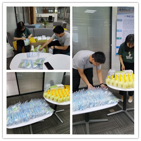 为确保返校工作有序进行,及时维护返校学生的健康利益,6月10日上午,陈雨浓、高利鹏、茹丽媛、胡轩豪等老师一起整理装点学生返校复学物资,并为返校学生准备健康包。一只只口罩、一副副手套和一瓶瓶消毒洗手液,饱含了学校老师对各位同学的关心关怀,也饱含了各位老师对同学们返校的期待。
