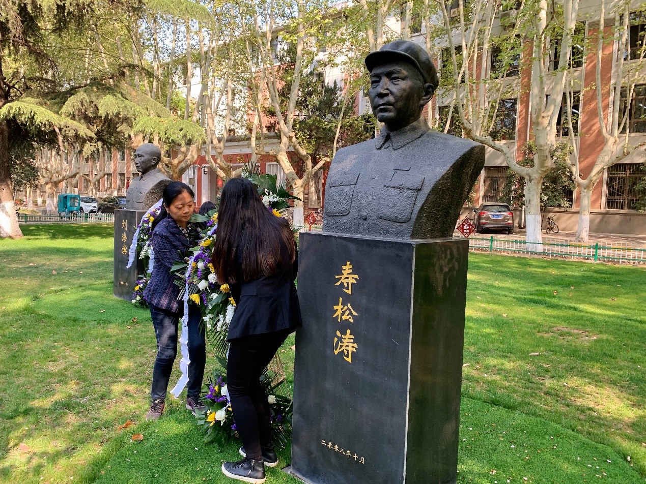 校友会副秘书长可方玲,教育基金会副主任徐伟侠,材料学院党委副书记黄越以及软件与微电子学院党委副书记张琨代表师生向寿松涛、刘海滨、季文美先辈敬献花篮,全体与会师生向三位先辈鞠躬致敬。