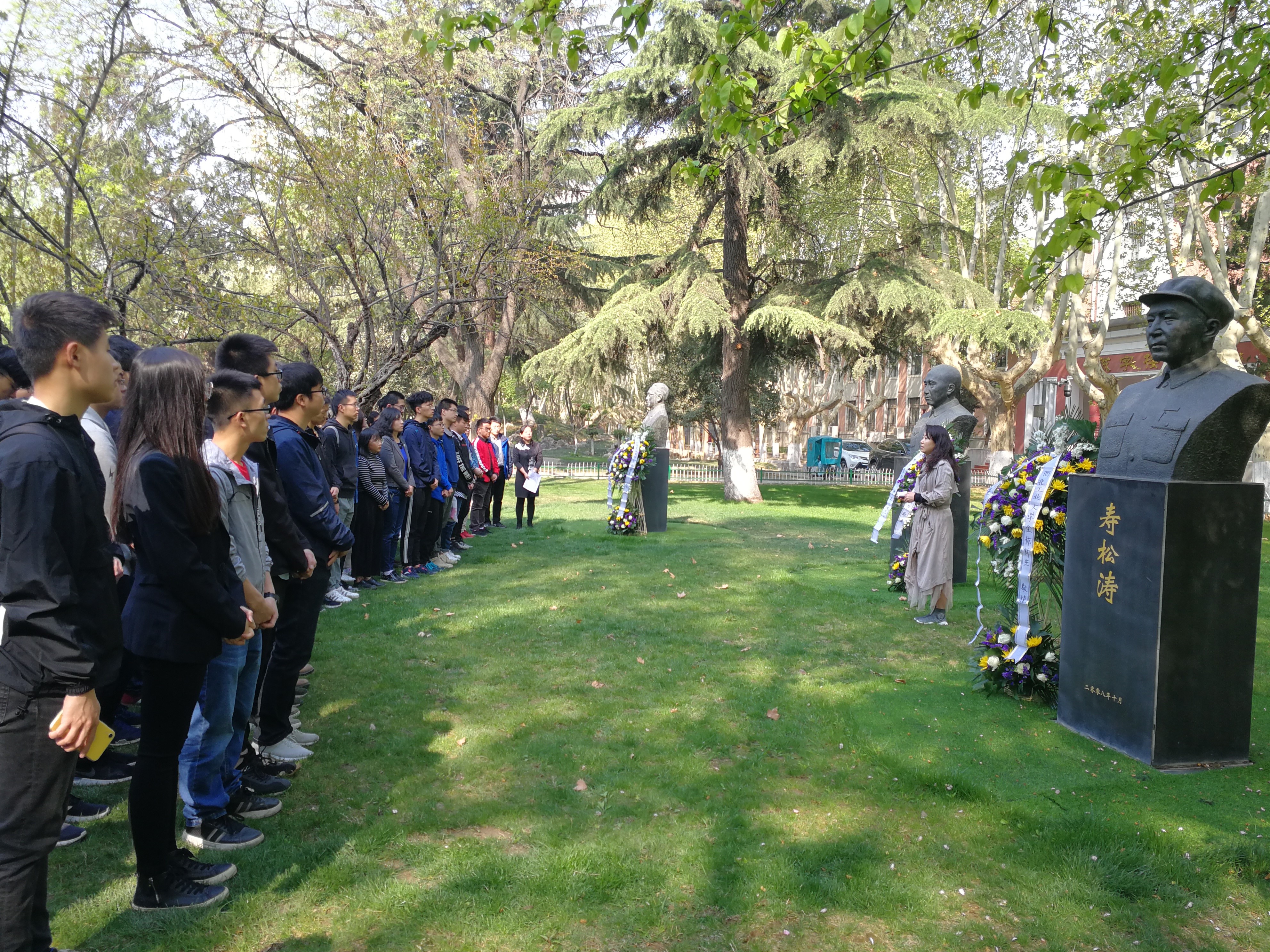 上午9时30分,金色的晨光穿过梧桐大道,百余名师生来到诚字楼三位先辈雕塑前参加本次清明纪念活动,活动场面安静肃穆。