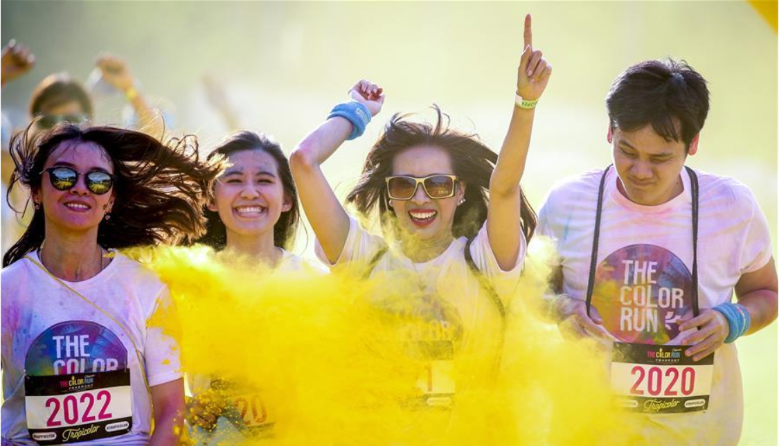 活动开始,参赛者需身穿自己DIY的白色T恤,从起点站出发,一路上将经历红橙黄蓝四个不同色彩的彩色站,到达彩色站后,参赛者们被喷洒上相应颜色的粉末。一路上,不论跑步速度的快慢,也不管跑步动作的张合,我们关注的,是参赛者以最昂扬的精神状态通过终点线。