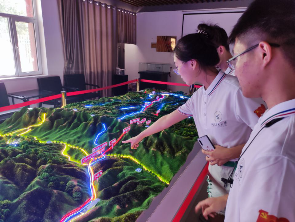 2.5公里的登山路途并不像天气一般轻松惬意,陡峭的山坡爬起来格外吃力,但值得庆幸的是,在这条通往山顶的“红军小道”上,还有还原了从江西瑞金到陕北长征路上重大事件的十八处微缩景观作陪。小道千回百转,“血战湘江”、“四渡赤水”、“懋功会师”等经典场景逐一呈现,当看到“苦不苦,想想革命老前辈;累不累,想想长征两万五”这句标语时,队员们备受鼓舞,更加坚定了前行的步伐。此次登山之行,让队员们感受了红军长征路途的劳苦艰辛,体会到了红军战士身上不畏艰难、勇当先锋的伟大精神,同时也对长征文化有了更深入的了解。