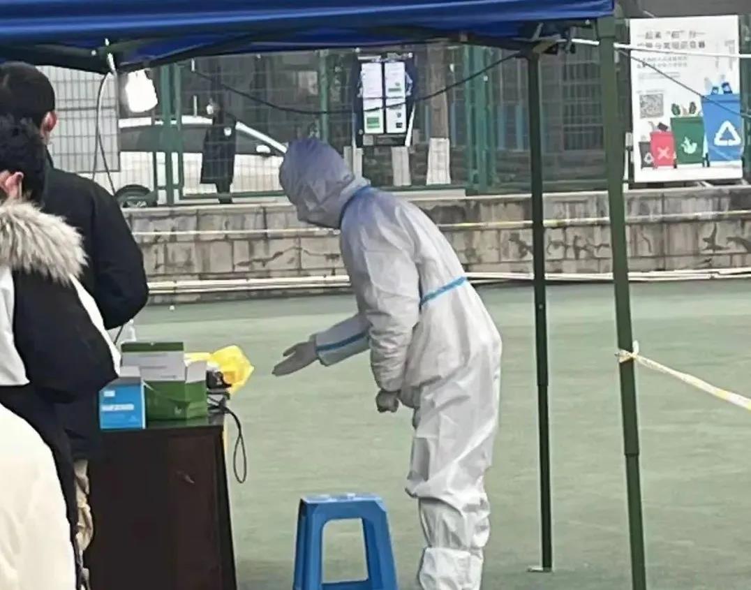 (身着白色防护服的余财庆在核酸点为同学们服务)