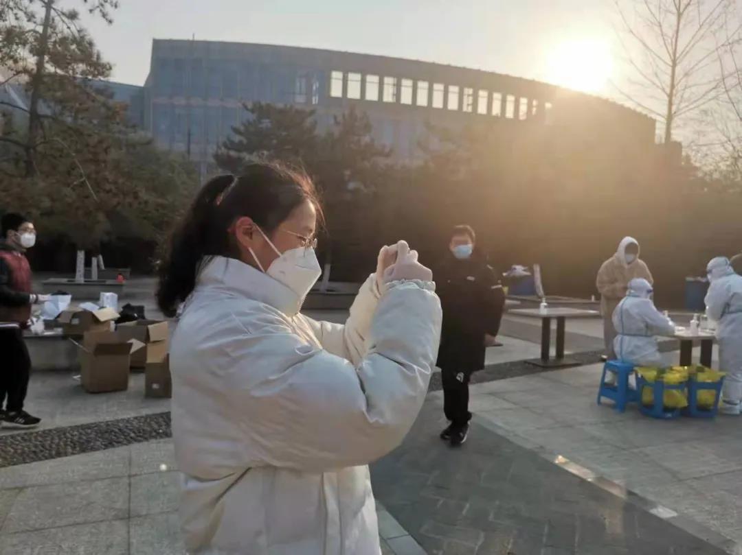 (图左一,韩莹在核酸检测点为志愿们拍摄照片)