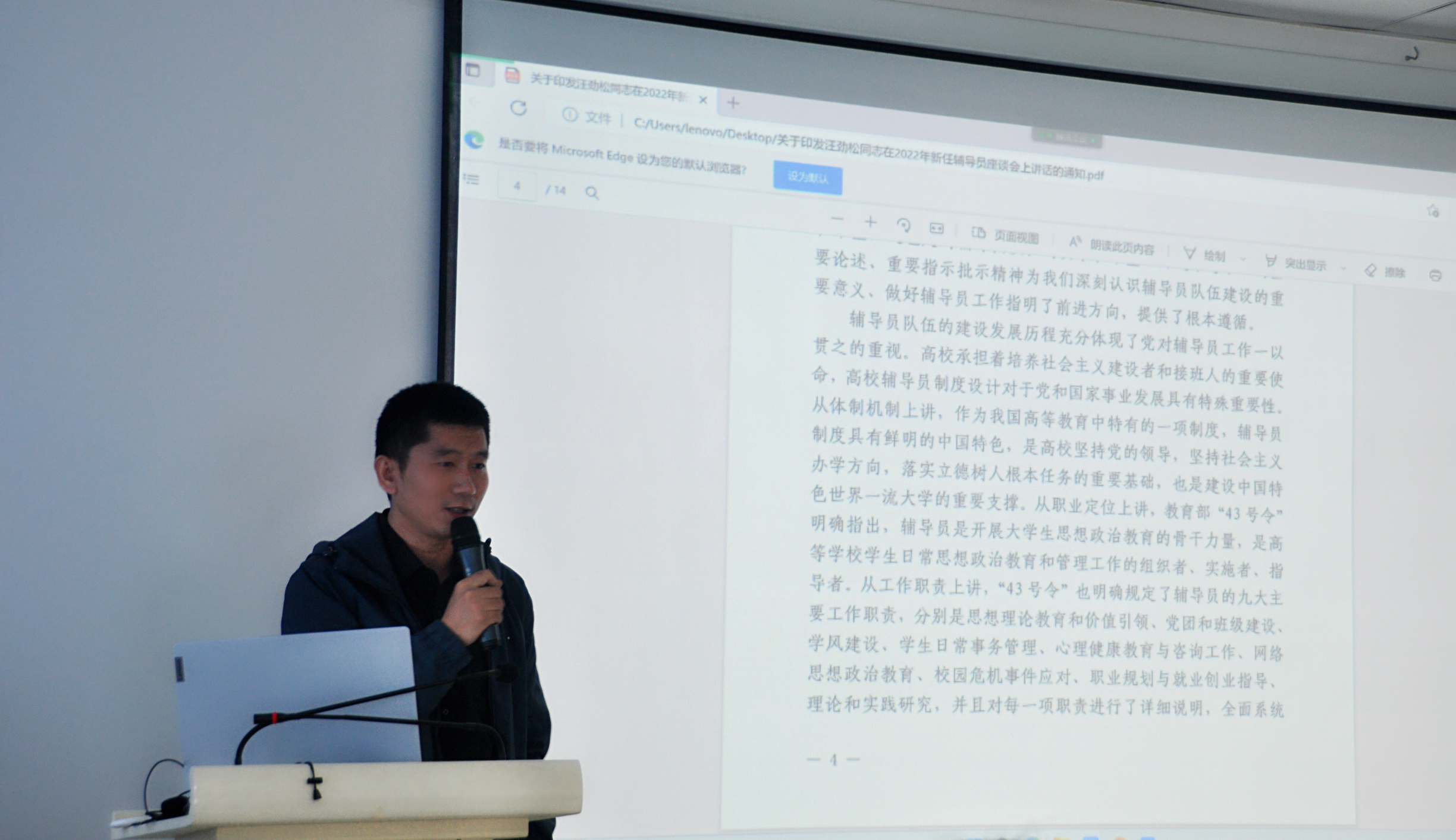 李晗作会议总结,他表示,党的二十大报告中强调:“我们要办好人民满意的教育,全面贯彻党的教育方针,落实立德树人根本任务,培养德智体美劳全面发展的社会主义建设者和接班人。” 学生工作的使命光荣、任务艰巨,各位老师任重道远。希望大家以党的二十大报告中关于教育工作的重要论述为根本遵循,以学校发展和学院建设为中心,以本次辅导员培训为契机,努力增长学识、学习经验、抓住特点、总结规律,做好学生的知心人,学生工作的热心人、学生成长的引路人。