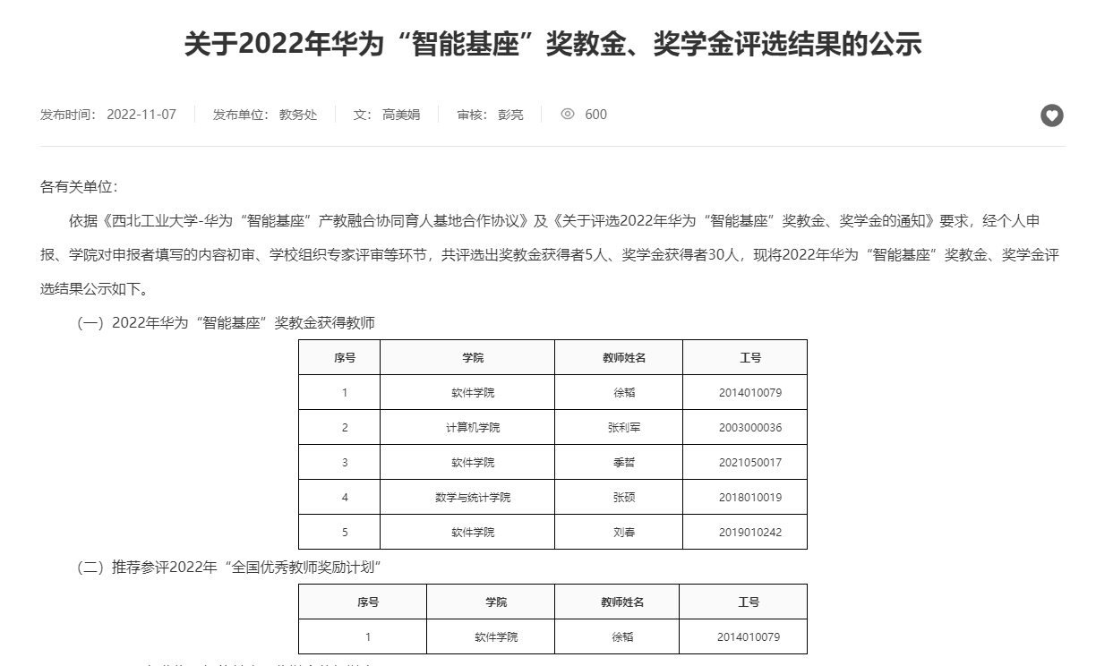 教师徐韬、季哲、刘春获得2022年华为“智能基座”奖教金(学校共5人);徐韬获得2022年“全国优秀教师奖励计划”参评推荐(学校仅1人)。