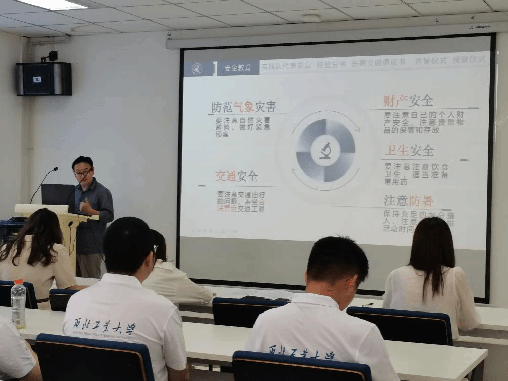 大会伊始,张记国进行了安全教育宣讲,从防范气象灾害、注意交通安全、财产安全、卫生安全以及注意防暑五方面展开。同时鼓励实践队队员在实践中增长见闻,争取获奖,提升时间质量,了解专业发展情况、就业情况等,做好人生规划。