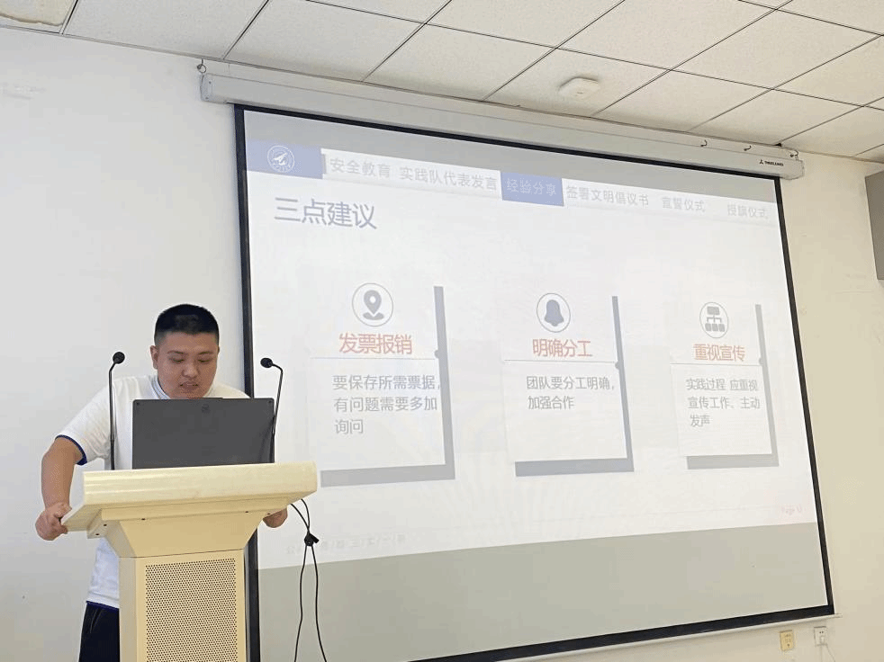紧接着,2023年寒假优秀实践队队长潘泽铭进行经验分享,提出丰富内容、明确分工及重视宣传三点重要建议。随后吴思远宣读文明倡议书,各实践队队长签署文明倡议书,并庄严宣誓:保证在社会实践期间,严格遵循“公诚勇毅”校训,秉承“三实一新”校风,躬身实践,运用专业知识,传播先进文化,坚持知行合一,注重在实践中学真知悟真谛、在磨炼中增长真本领。以最饱满的热情和最高昂的斗志,保质保量完成各项实践任务,彰显工大学子青春风采!
