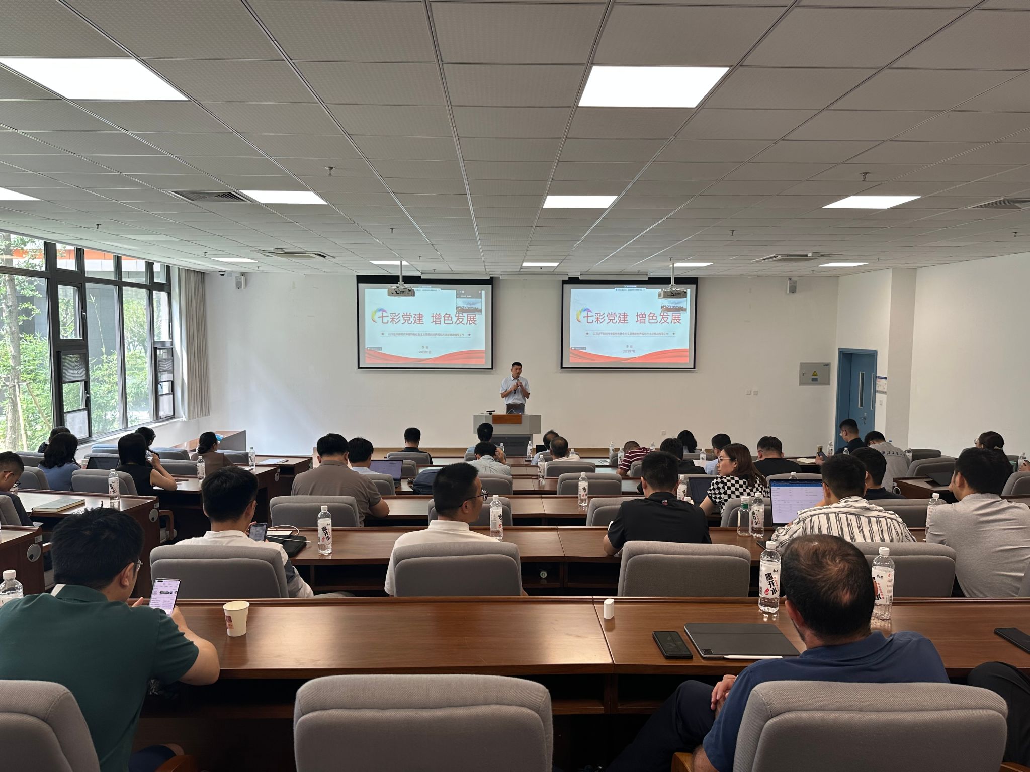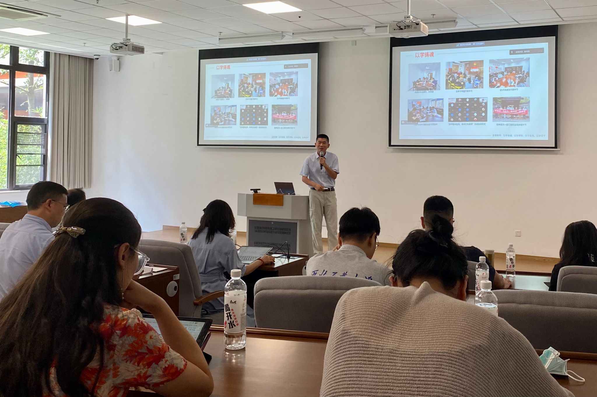 会议第一项,学院党委书记李晗以“七彩党建,增色发展——以习近平新时代中国特色社会主义思想的世界观和方法论推动指导工作”为题向与会教职工讲授党课,将“六个坚持”与推动学院具体工作相结合作以阐释,总结学院春季学期党建工作在“以学铸魂、以学增智、以学正风、以学促干”方面好的做法和取得的成绩,并以“七彩”为引,向大家讲述了“引领、关爱、先锋、奉献、成长、纯净、创新”的意义与做法。按照《关于在全校开展师德集中学习教育的通知》要求,李晗带领全体教职工学习《“以案促学”加强师德师风建设》报告,强调师德师风贯穿教师职业生涯全过程,并进行师德师风典型案例警示教育。