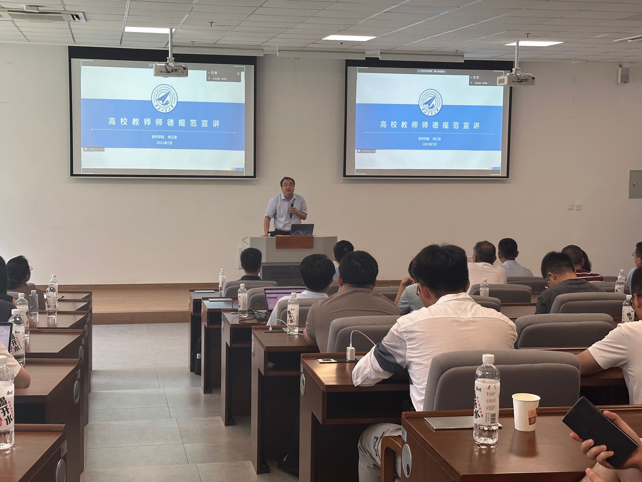 会议第二项,学院院长郑江滨作《高校教师师德规范宣讲》,带领全体教职工学习了习近平总书记关于教师队伍建设的重要指示批示精神和国家关于高校教师师德规范相关文件要求,对《新时代高校教师职业行为十项准则》《研究生导师指导行为准则》《关于高校教师师德失范行为处理的指导意见》《少妇做爱