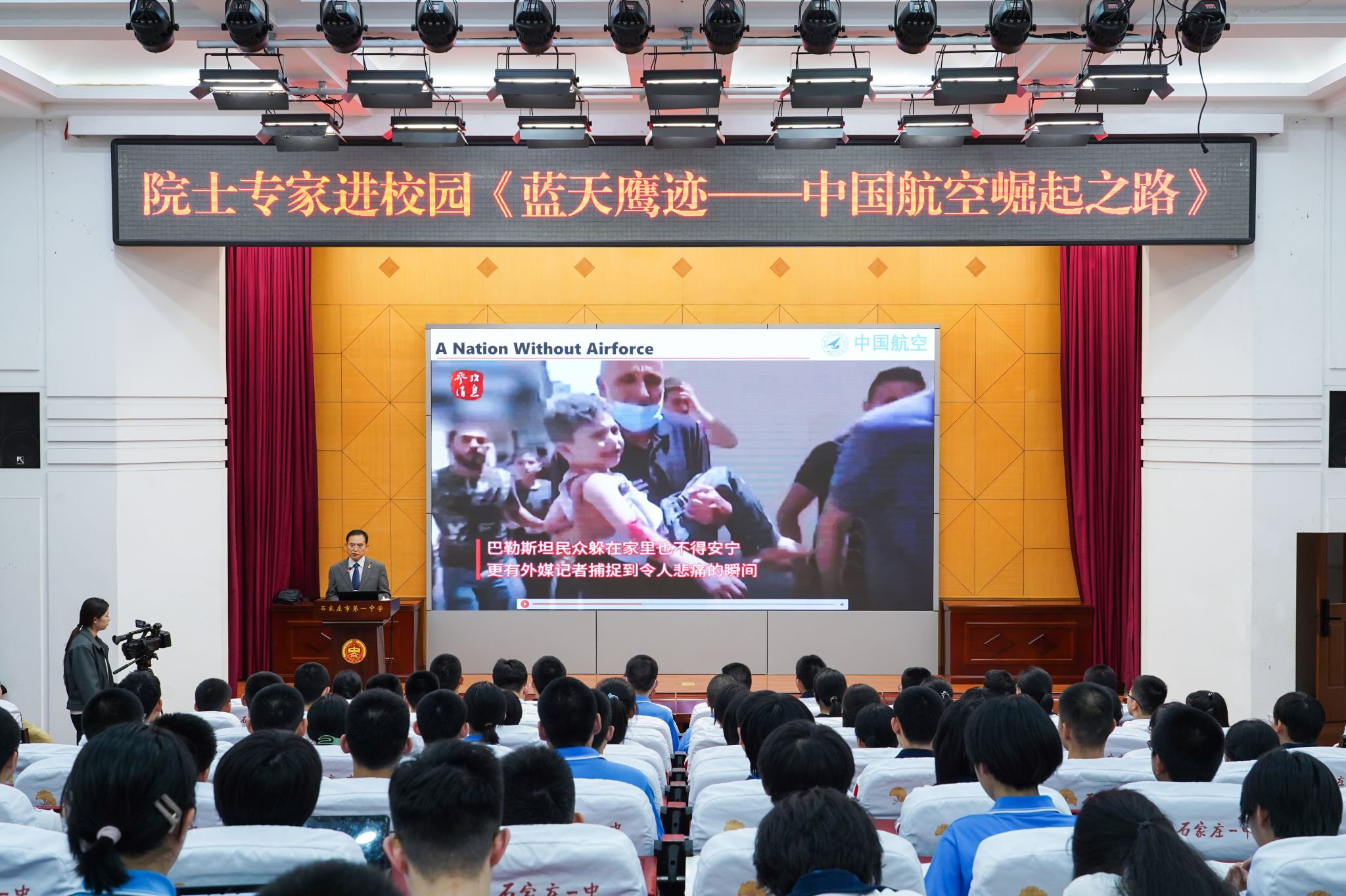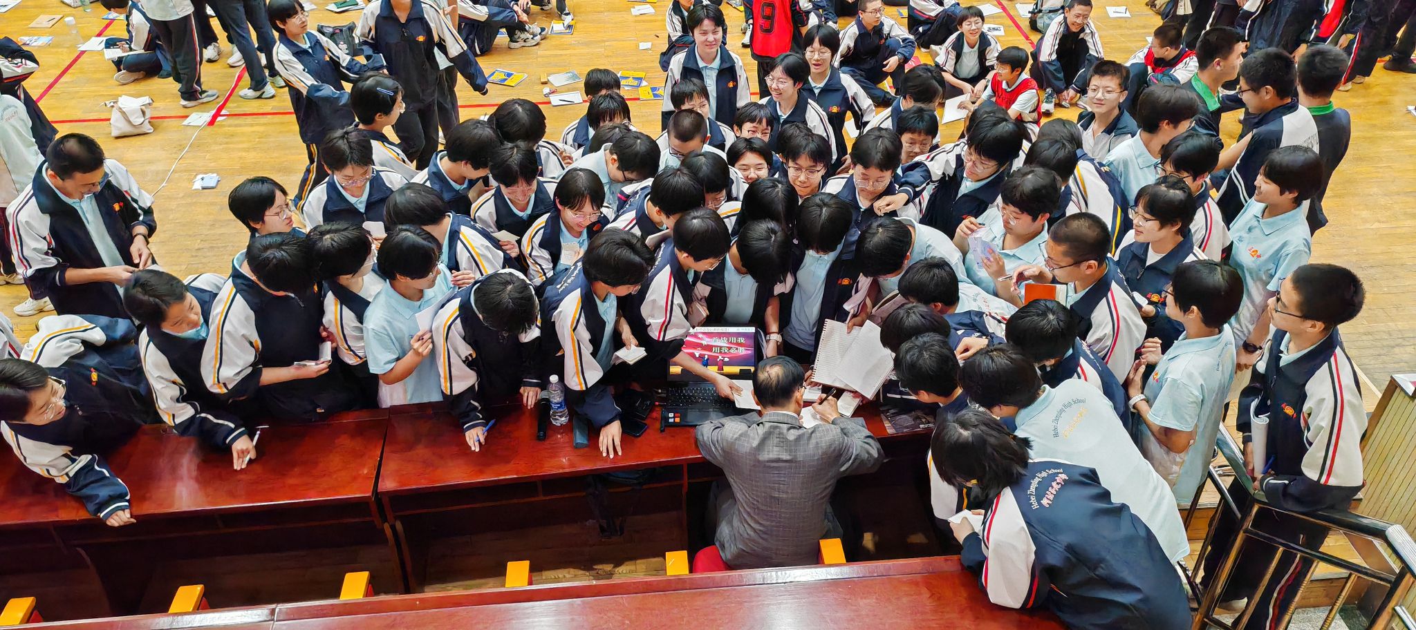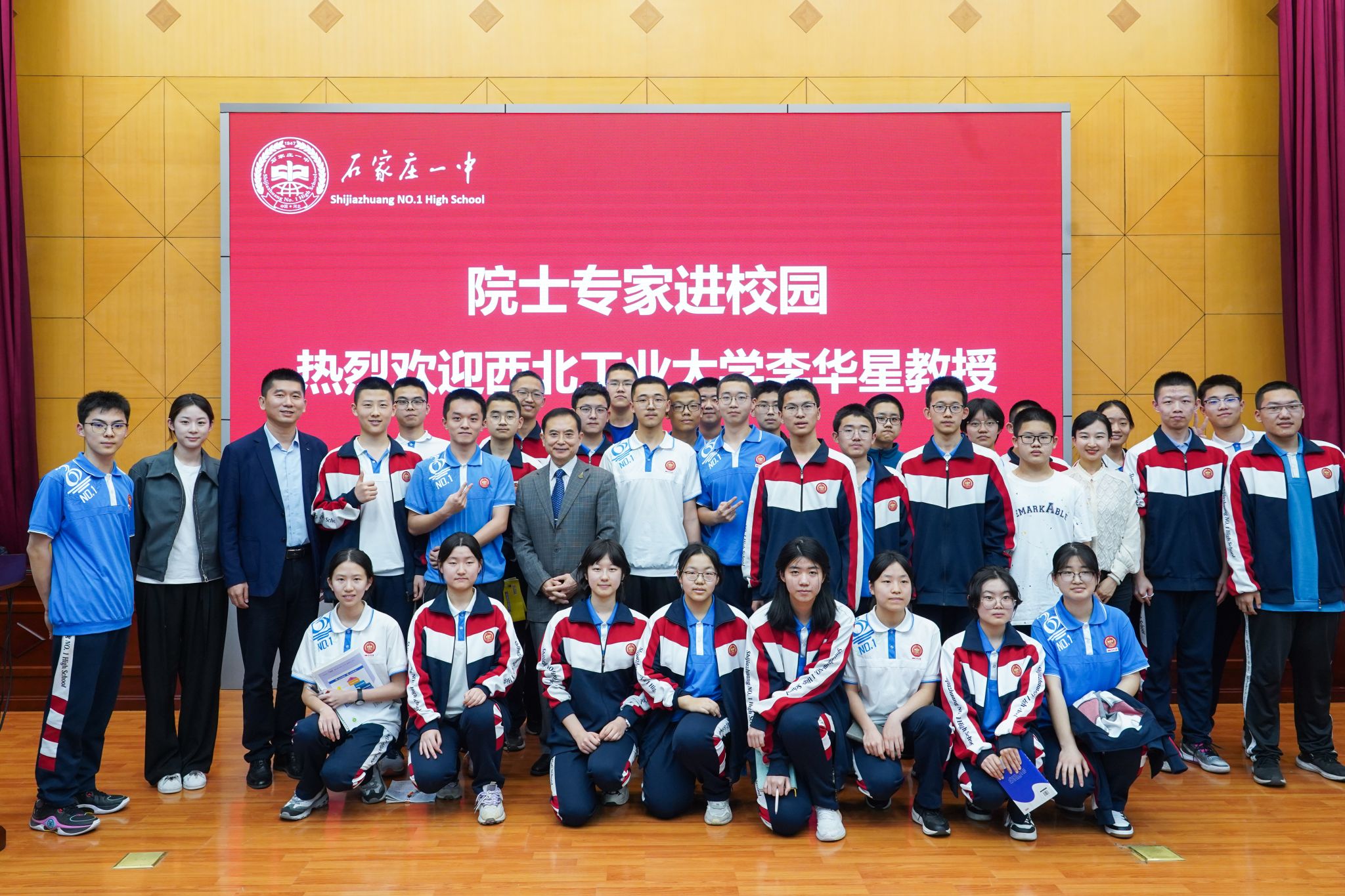 李华星教授在石家庄一中、正定中学做题为“蓝天鹰迹”的科普讲座,两场参加学子共计约1500人。教授用富有感染力的声音,讲述中国航空历史,言言入耳、句句入心,直抵灵魂深处,堪称精神盛宴。聆听时大家多次主动鼓掌,现场被点燃,几句话就能“炸”一次场。演讲结束,李华星教授立刻被孩子们层层包围,索要签名。