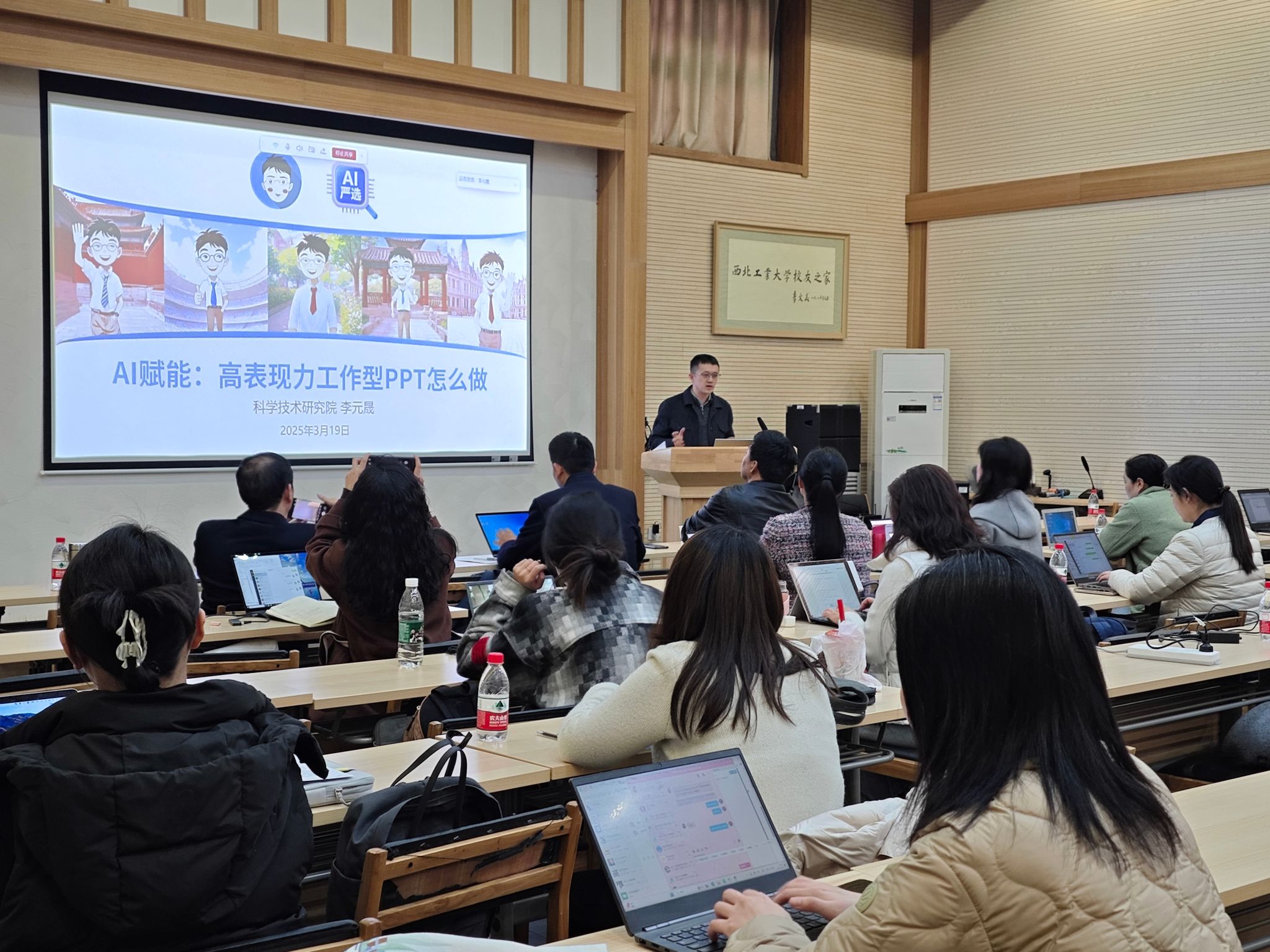 科学技术研究院党支部党员李元晟作《AI赋能:高表现力工作型PPT制作》专题报告。报告从整体风格、字体规范、色彩风格、排版原则、美化技能、AI赋能六个方面,深入浅出地讲解了PPT制作技巧与如何运用AI技术提升PPT制作效率与质量。李元晟以幽默风趣的语言和生动形象的案例,将复杂的技术讲解变得妙趣横生。报告中,他还通过现场演示,展示了如何用AI工具快速生成精美图片和视频,为与会党员提供了实用的工作指导。