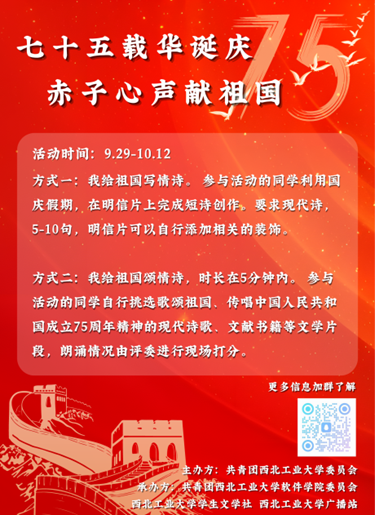 在这个金色的秋天,我们即将迎来一个特别的日子——祖国的生日。为了表达我们对祖国的无限热爱和崇高敬意,我们将举办一场主题为“为祖国献情诗”的诗歌活动。我们诚邀每一位热爱诗歌、热爱祖国的朋友,用你们最真挚的情感,最动人的词句,共同谱写对祖国的赞歌。活动期间,参赛者可以在指定地点领取特制的明信片,围绕“对祖国的爱”这一主题进行诗歌创作,诗歌形式不限,可以是现代诗、散文诗、古体诗等。活动结束后,校文学社组织评委团队,对所有提交的作品进行评审,根据其创意、情感表达和文学价值评选出最佳作品。此次诗歌创作赛道不仅是对创作能力的考验,更是对祖国深情厚谊的表达,弘扬爱国主义精神,增强校园文化氛围,让学生们在诗歌中表达对祖国的热爱和对未来的憧憬,彰显西工大学子的爱国精神。