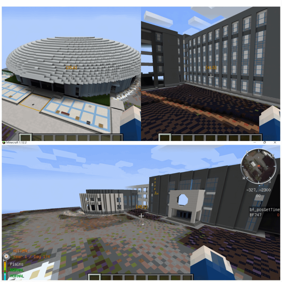 复原工程的创作过程充满挑战与乐趣。队员们巧妙地运用学校内部拍摄的照片、无人机扫描生成的3D模型以及卫星图像,将游泳馆的外观、教学西楼以及两教学楼周边的道路和绿化景观,精确地复原出来。他们严谨地审视图像与模型,确保各个细节的精准度,运用游戏中的立方体雕刻工具、Blockbench建模软件、独特材质、光影表现及纹理贴图等技术,以增强模型的真实感和精细度。同时团队成员在Blockbench建模中通过精确的比例控制和边缘处理,成功解决了模型大小适宜性和拼接连贯性的关键技术问题,优化了模型在Minecraft平台中的呈现效果。