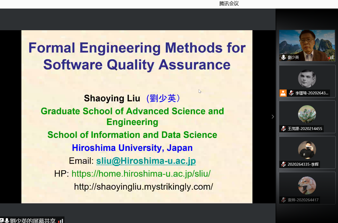 主讲人简介:刘少英是日本著名计算机专家,现任广岛大学计算机科学教授,IEEE Fellow。1992年获英国曼彻斯特大学计算机科学博士学位。自1994年以来,已主持20余个研究项目,创立和发展了“软件开发的形式化工程方法”,研制开发了SOFL形式化工程开发语言和方法,由Springer出版专著一本,编著由IEEE CS Press和Springer LNCS系列出版的论文集8本,在IEEE Transactions on Software Engineering等国际学术期刊和国际会议发表160多篇论文。曾被Journal of Systems and Software评为1993年至1996年期间的在系统和软件工程领域的世界top 15名学者之一。
