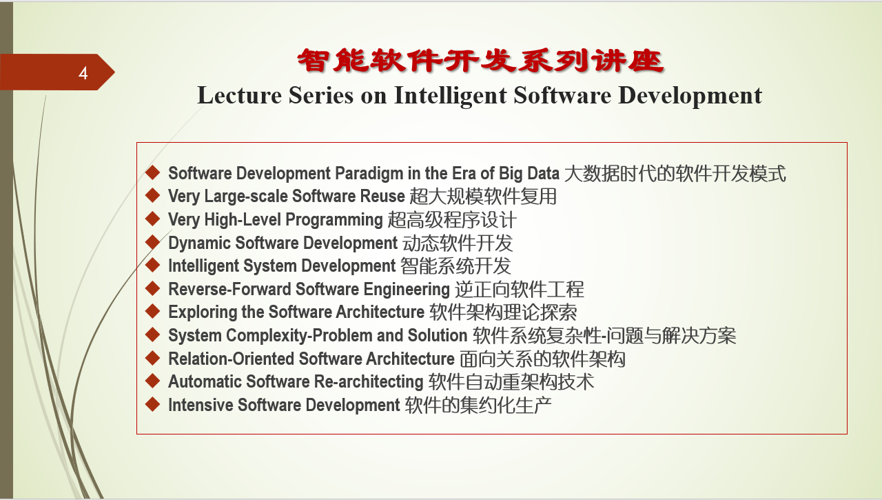 “智能化软件开发技术”( Software Development of Dataization, Intelligent, Architecturization and Intensification)全英文课程顺利结课。 本次课程邀请李海宽教授担任主讲,该门课程面向研究生和本科生开放,选课学生数高达248人。该门课程的师生协同环节得到选课学生的一致好评。