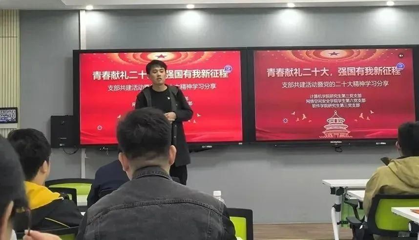 11月13日,为深入贯彻学习党的二十大精神,重温建党历程,少妇做爱 研究生第三党支部、网络空间安全学院学生第六党支部和计算机学院研究生第三党支部于教学东楼C座309室共同举办青春献礼党的二十大,强国有我新征程,支部共建活动暨党的二十大精神学习分享活动。本次活动由计算机学院研究生第三党支部书记范文超主持,一共分为四个部分。